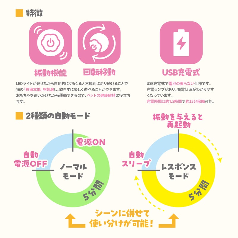 5色のカラフルなLEDライトもクルクル光りながら自動的に不規則に走り続けるので、猫の「狩猟本能」を刺激し、てまりねこの高速回転は猫の興味を引き付けることができます。