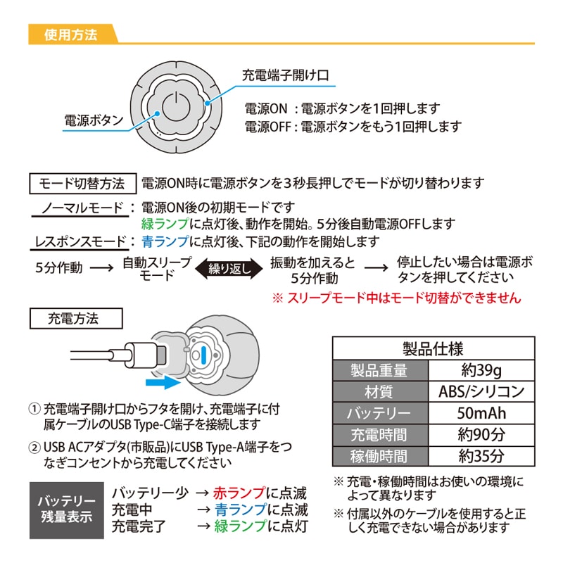 レスポンスモード:LEDが青色に3秒点灯し、5分後に自動的にスタンバイ状態・ペットが触ると再起動