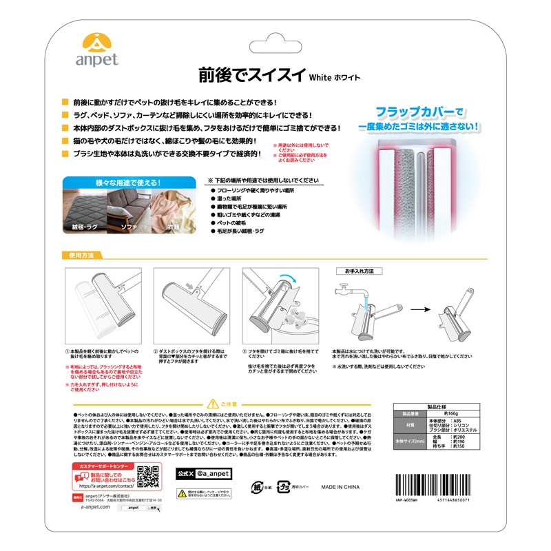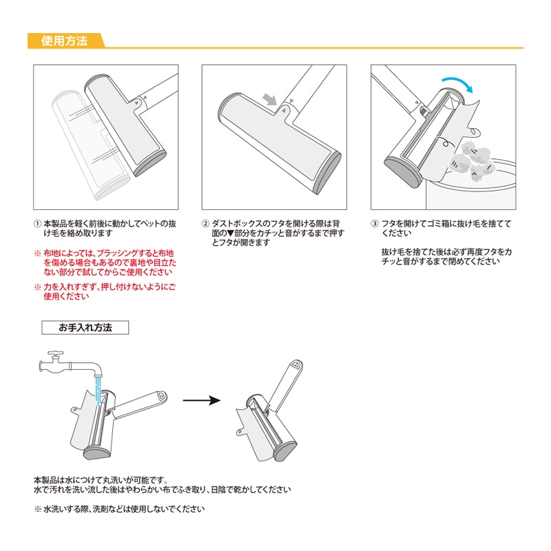 前後にローラーを動かすことにより摩擦でおこった静電気を利用して、ペットの毛やほこりを効果的に吸着します。