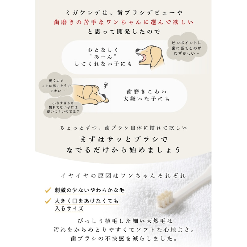 ・獣医師と歯ブラシ職人が共同開発した超やわらかな小型犬用天然毛歯ブラシです。