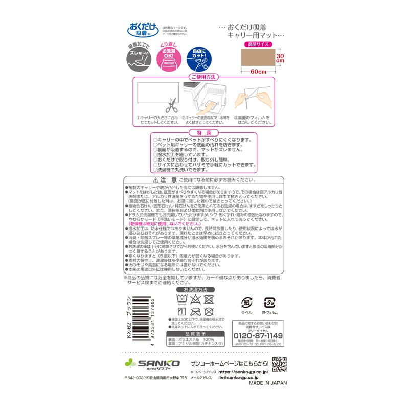 ・お洗濯の後は十分に乾燥させてからお使いください。水分を含んでいますと裏面の吸着部分がはく離することがあります。