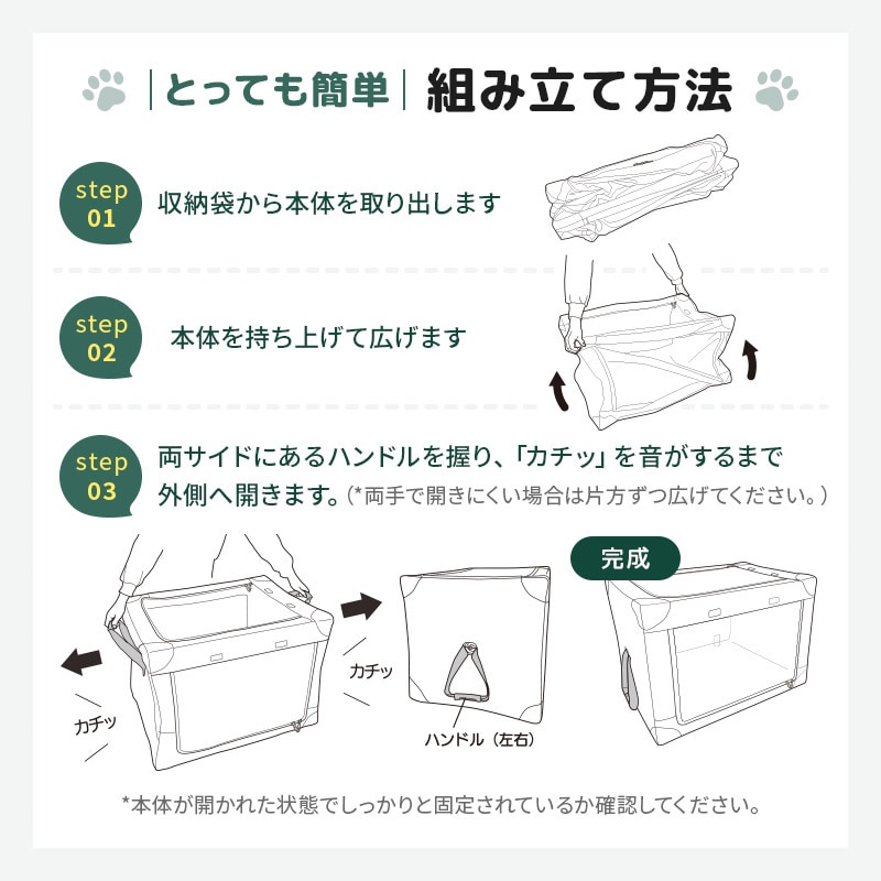・テントのようにサッと組み立てて、あっという間に使えるペットハウスです!場所を選ばず様々なシーンで活躍します。