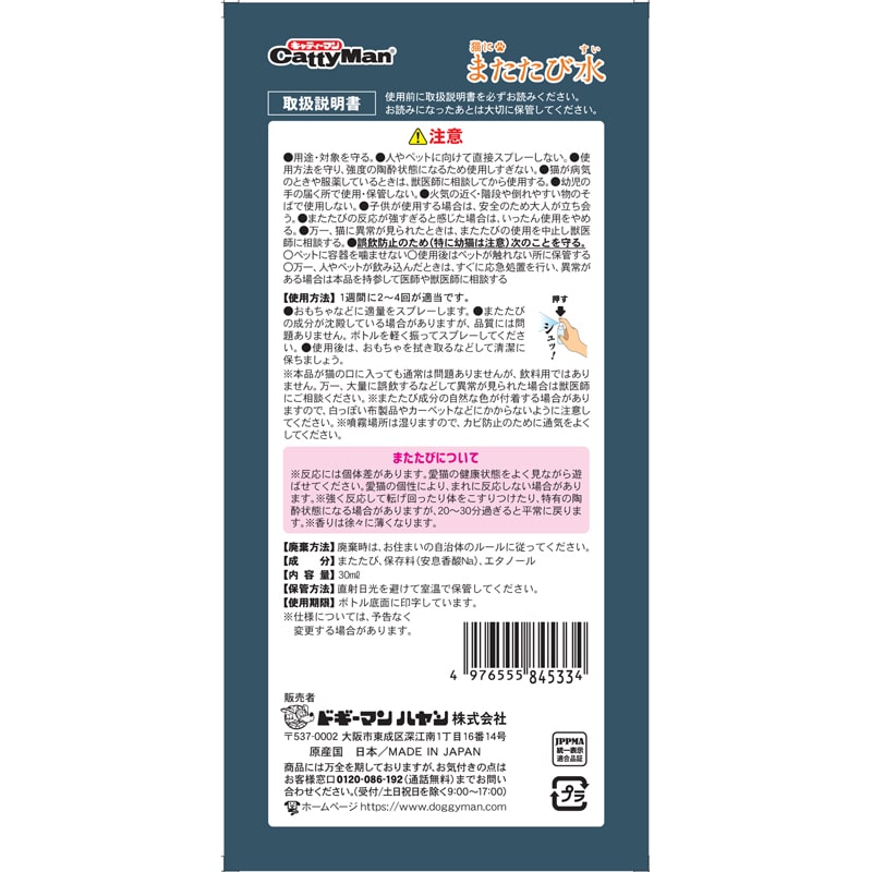 【材質/素材】またたび水:またたび、保存料(安息香酸Na)、エタノール