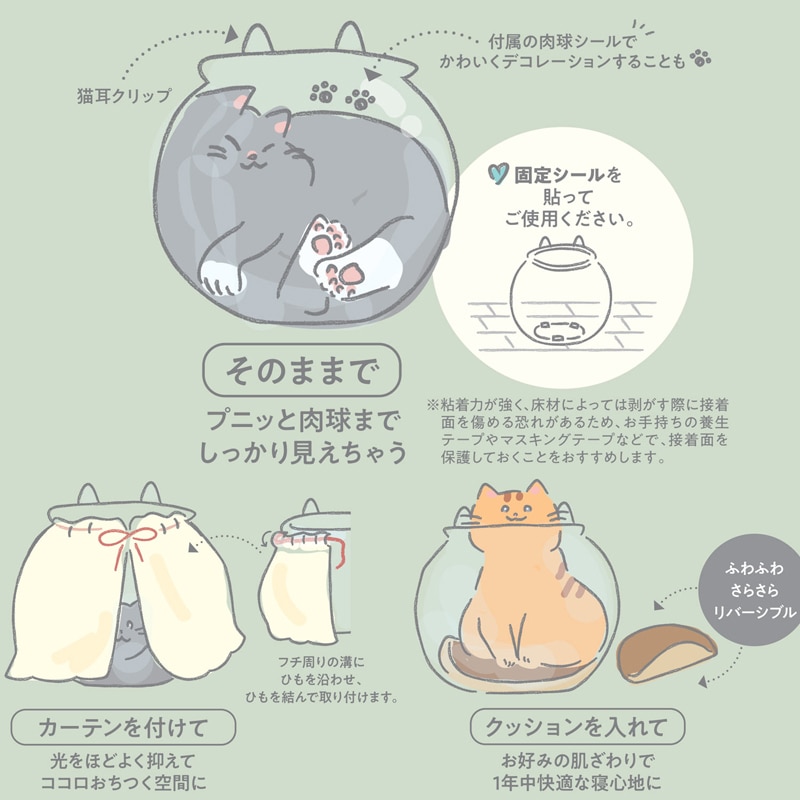 【セット内容】本体、クッション、カーテン、肉球シール、固定シール、猫耳クリップ