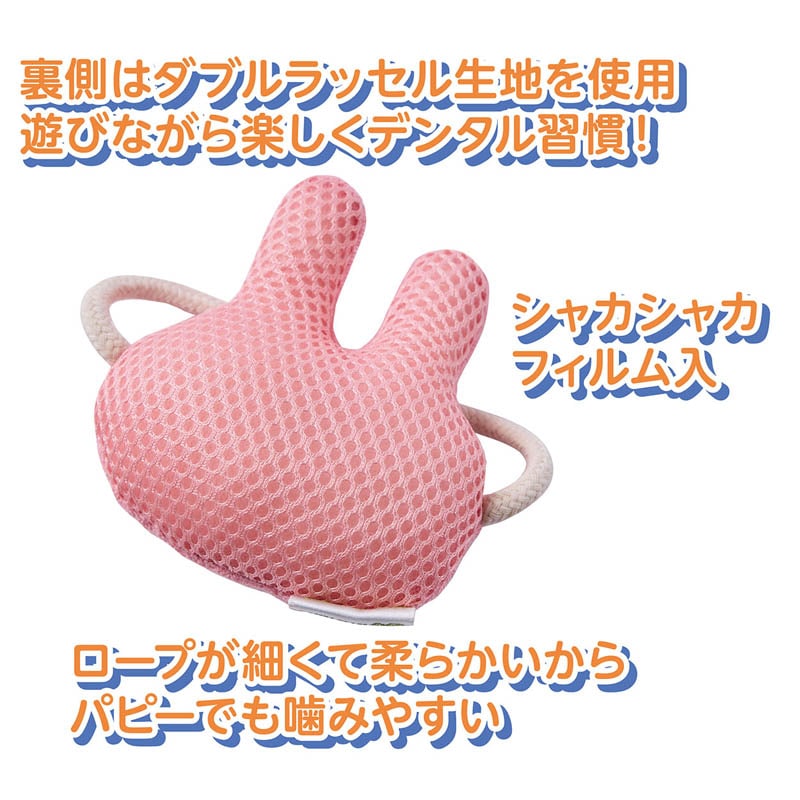 ・表面に噛みやすいパイル生地と、歯磨き効果のあるダブルラッセル生地・ロープを採用。
