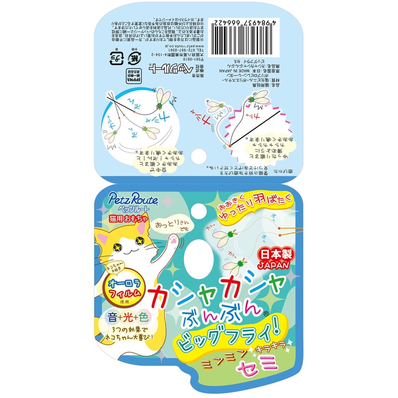 おおきなオーロラフィルムのハネフィルムを使用し、カシャカシャ音とキラキラ光と見やすい色で猫ちゃんの狩猟本能を刺激します。