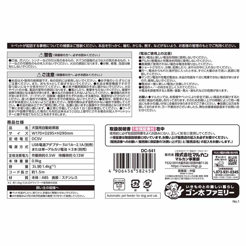 ・フード詰まりや故障が発生した場合にも対応できるよう2日以上留守にされる場合は知人やペットシッターに様子を見てもらうことをおすすめします。
