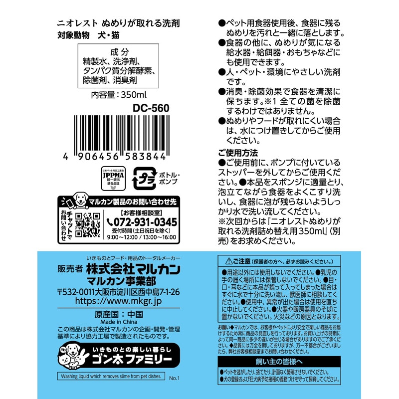 【使用方法】本品をスポンジに適量とり、泡立てながら食器をよくこすり洗いし、食器に泡が残らないようしっかり水で洗い流してください。ぬめりやフードが取れにくい場合は、水につけ置きしてからご使用ください。