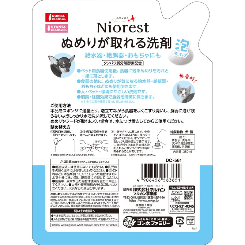 【使用方法】詰め替え後、本品をスポンジに適量とり、泡立てながら食器をよくこすり洗いし、食器に泡が残らないようしっかり水で洗い流してください。ぬめりやフードが取れにくい場合は、水につけ置きしてからご使用ください。