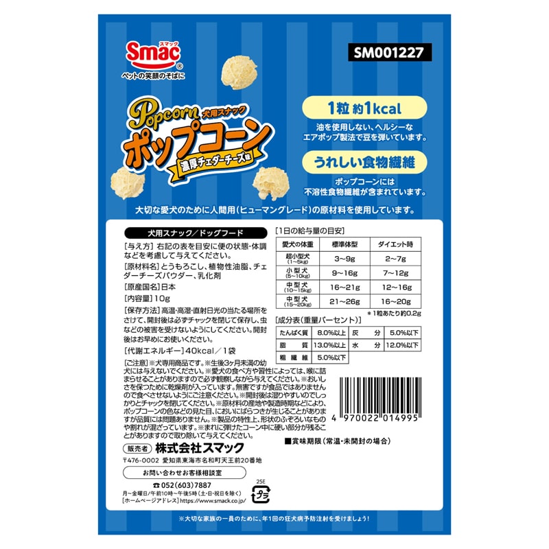 ・「愛犬に自分と同じ美味しいおやつを」の声にお応えし、大切な愛犬のために食品用(ヒューマングレード)の原材料を使用した犬用スナック「ポップコーン」のチェダーチーズ味です。