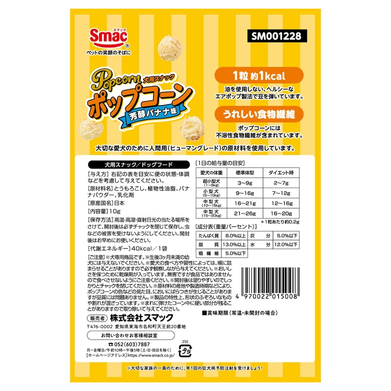 ・「愛犬に自分と同じ美味しいおやつを」の声にお応えし、大切な愛犬のために食品用(ヒューマングレード)の原材料を使用した犬用スナック「ポップコーン」の芳醇バナナ味です。