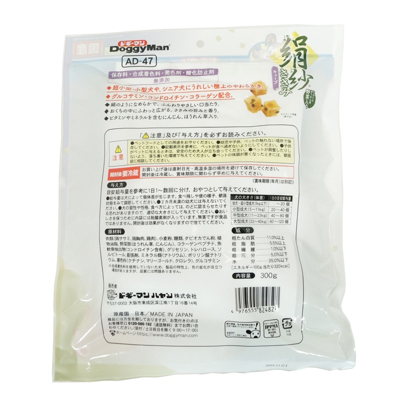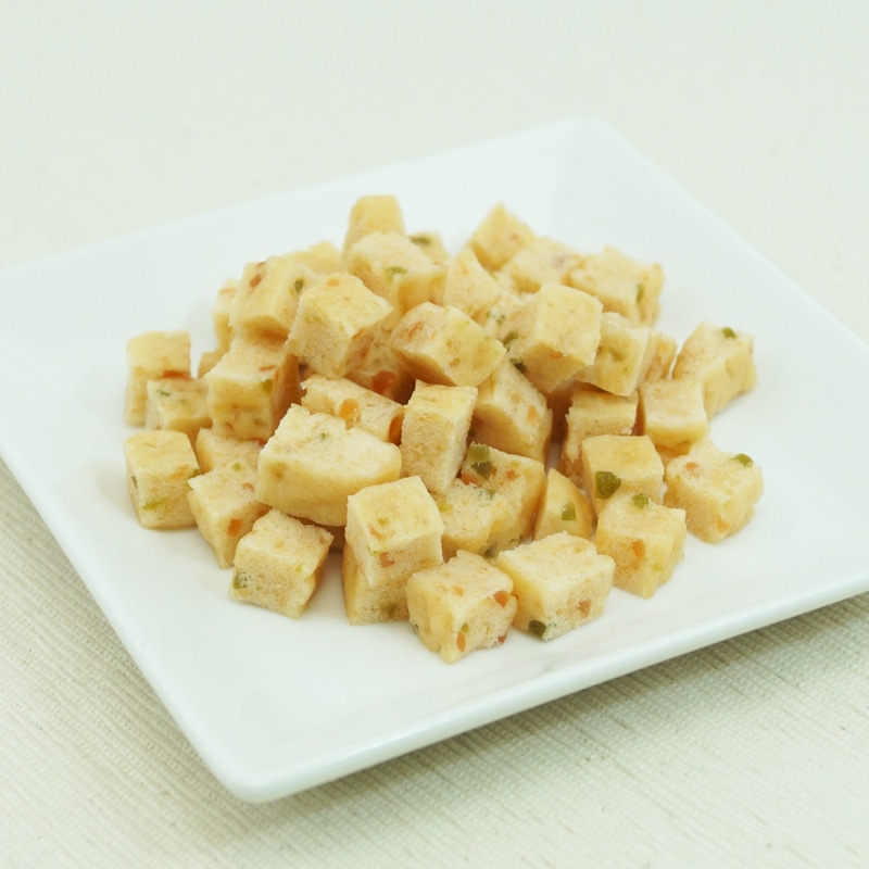 【原材料(成分)】肉類(鶏ササミ、鶏胸肉、鶏肉)、小麦粉、糖類、タピオカでん粉、植物油脂、野菜類(ほうれん草、にんじん)、コラーゲンペプチド、魚軟骨抽出物(コンドロイチン含有)、グリセリン、トレハロース、ソルビトール、膨張剤、ミネラル類(ナトリウム)、ポリリン酸ナトリウム、着色料(クチナシ、マリーゴールド、クロレラ)、グルコサミン