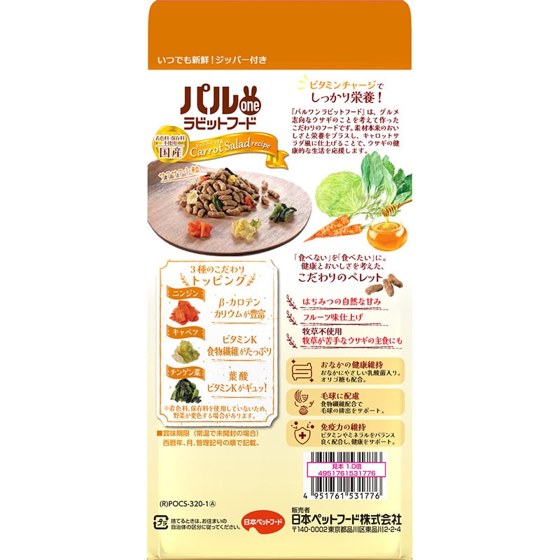 【原材料(成分)】小麦ふすま、大豆皮、雑穀糠、トウモロコシ、脱脂大豆、小麦粉、ビートパルプ(食物繊維源)、乾燥キャベツ、乾燥チンゲン菜、乾燥ニンジン、コーンジャムミール、酵母菌培養物、ハチミツ、パイナップルパウダー、マンゴーパウダー、オリゴ糖、ミネラル類(カルシウム、リン、ナトリウム、クロライド、鉄、銅、マンガン、亜鉛、ヨウ素、コバルト)、アミノ酸類(メチオニン、リジン)、ユッカ抽出物、ビタミン類(A、B1、B2、B6、B12、D、E、ナイアシン、パントテン酸、ビオチン)、香料、枯草菌、乳酸菌