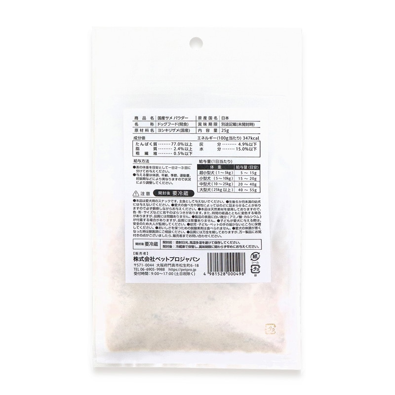 【保証成分】たんぱく質77.0%以上、脂質2.4%以上、粗繊維0.5%以下、灰分4.9%以下、水分15.0%以下