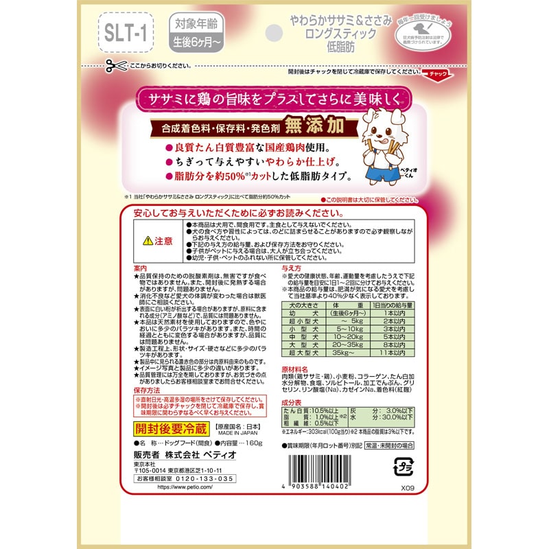 脂肪分を約50%カットした低脂肪タイプ(ペティオ「やわらかササミ&ささみロングスティックタイプ」比)だから、肥満が気になるワンちゃんにぴったり。