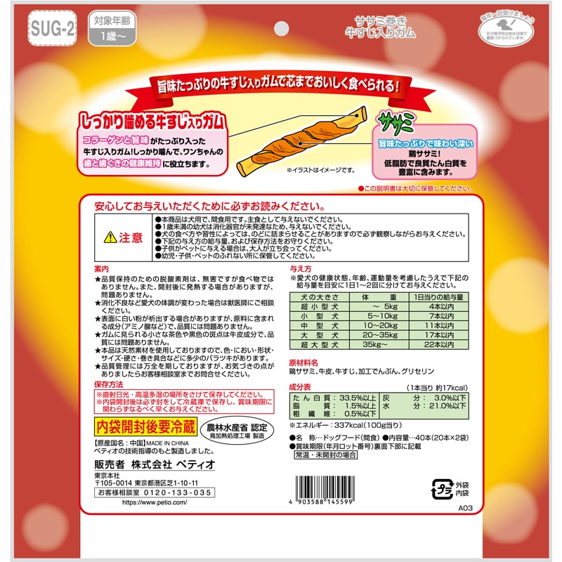 【原材料(成分)】鶏ササミ、牛皮、牛すじ、加工でんぷん、グリセリン