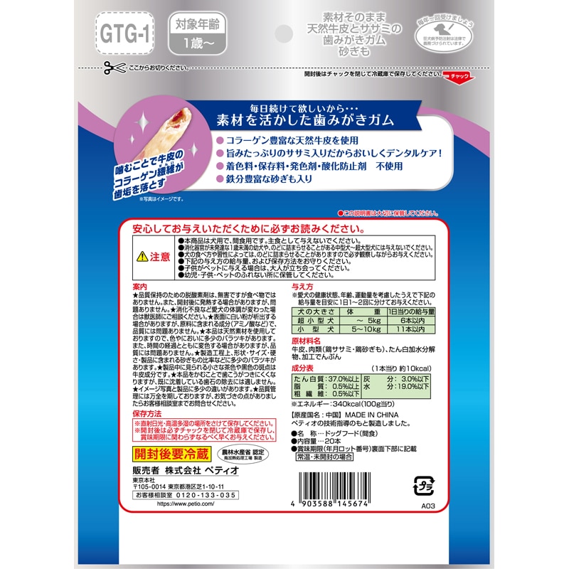 素材そのまま 天然牛皮とササミの歯みがきガム 砂ぎも 20本入