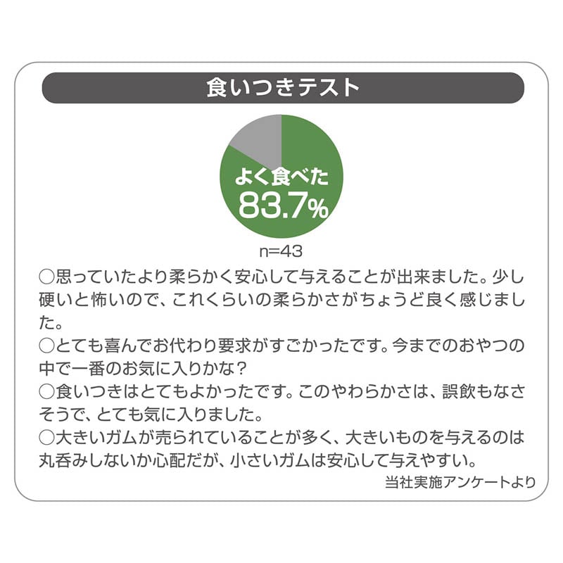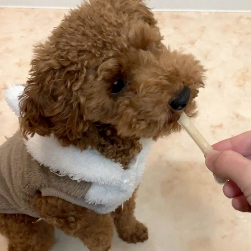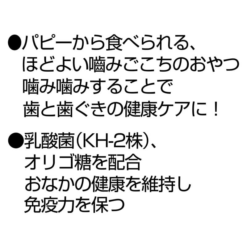 ・育ちざかりのパピーにぴったりなオーラルケアができて乳酸菌も配合した、ほどよい弾力がクセになる噛み噛みトリーツです。