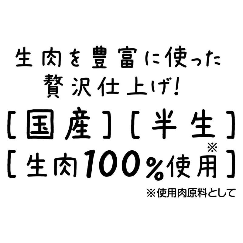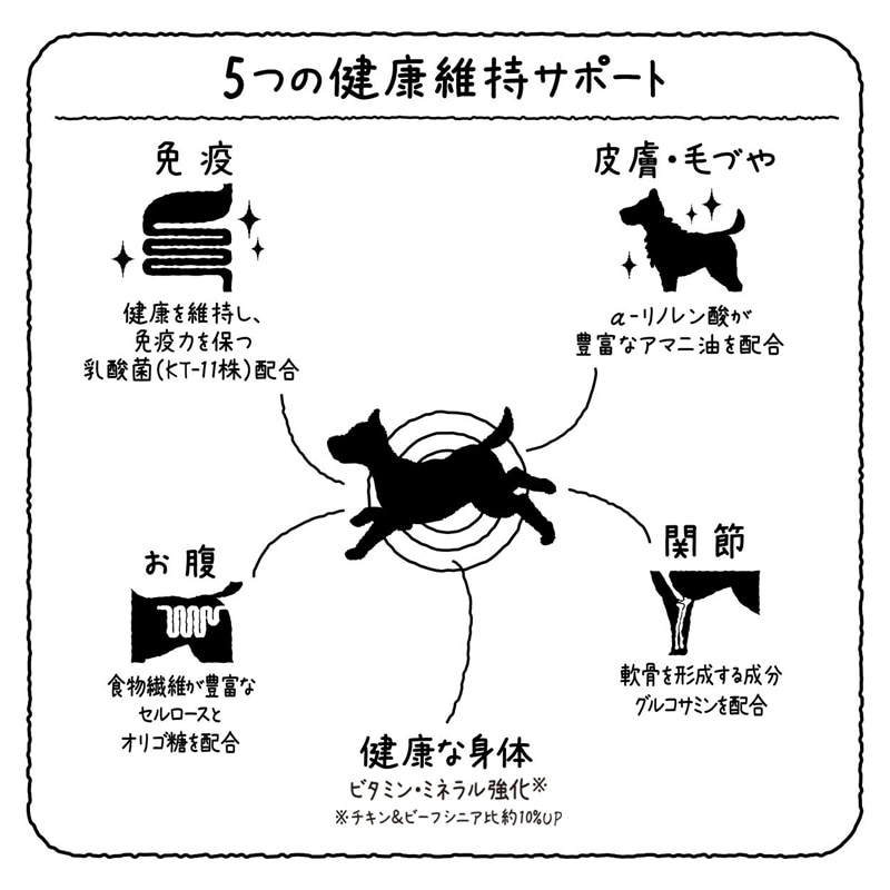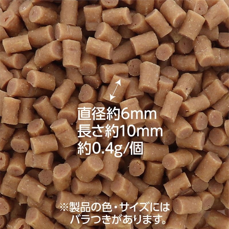 【原材料(成分)】肉類(鶏、牛、豚レバー)、脱脂大豆、糖類、植物性油脂、でんぷん類、オリゴ糖、小麦粉、アマニ油、酵母、乳酸菌(KT-11株)、加工でんぷん、グリセリン、ミネラル類(カルシウム、カリウム、リン、亜鉛、鉄、銅、マンガン、ヨウ素、コバルト、ケイ素、塩素)、ソルビトール、pH調整剤、セルロース、リン酸塩(Na)、ビタミン類(A、B2、B12、D、E、コリン)、グルコサミン、メチオニン