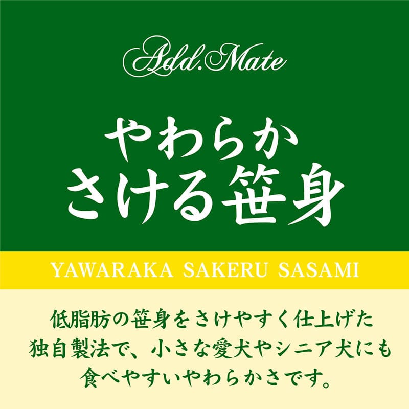 ・低脂肪の笹身をさけやすく独自製法で仕上げた、小さな愛犬やシニア犬にも食べやすいやわらかさです。