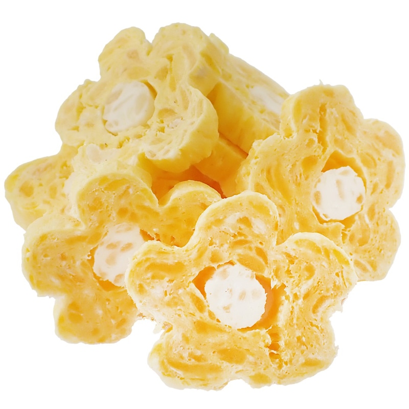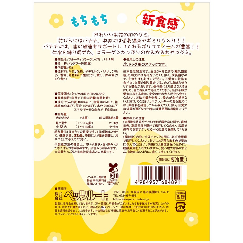 【原材料(成分)】牛皮、米粉、ヤギミルク、バナナ、グリセリン、香料、着色料(二酸化チタン、黄5)、保存料(ソルビン酸K)