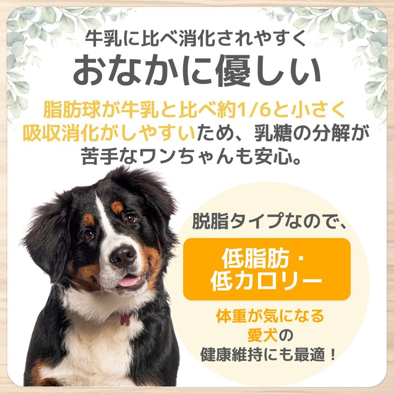 ・ヤギミルクは脂肪球が牛乳と比べ約1/6と小さく吸収消化がしやすいため、乳糖の分解が苦手なワンちゃんも安心。