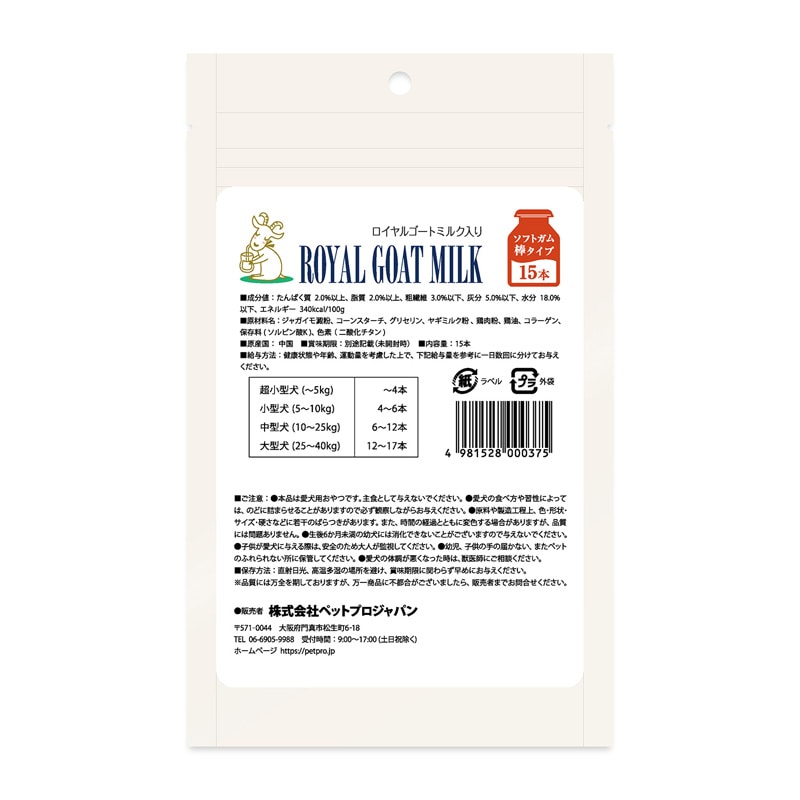 ペットプロ ロイヤルゴートミルク入りガム 棒タイプ 15本