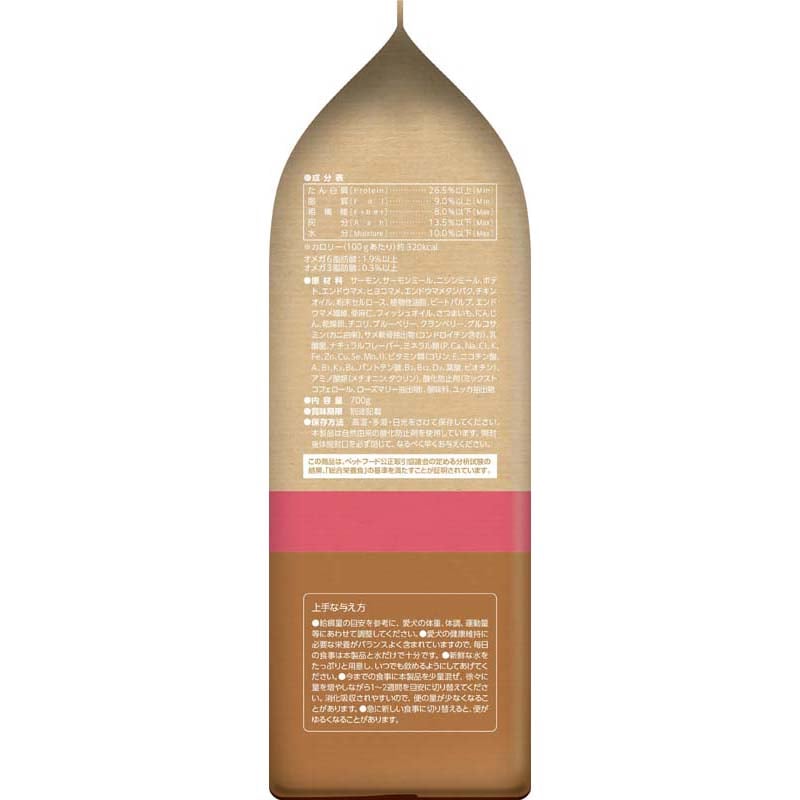 【原材料(成分)】サーモン、サーモンミール、ニシンミール、ポテト、エンドウマメ、ヒヨコマメ、エンドウマメタンパク、チキンオイル、粉末セルロース、植物性油脂、ビートパルプ、エンドウマメ繊維、亜麻仁、フィッシュオイル、さつまいも、にんじん、乾燥卵、チコリ、ブルーベリー、クランベリー、グルコサミン(カニ由来)、サメ軟骨抽出物(コンドロイチン含む)、乳酸菌、ナチュラルフレーバー、ミネラル類(P、Ca、Na、Cl、K、Fe、Zn、Cu、Se、Mn、I)、ビタミン類(コリン、E、ニコチン酸、A、B1、K3、B6、パントテン酸、B2、B12、D3、葉酸、ビオチン)、アミノ酸類(メチオニン、タウリン)、酸化防止剤(ミックストコフェロール、ローズマリー抽出物)、酸味料、ユッカ抽出物