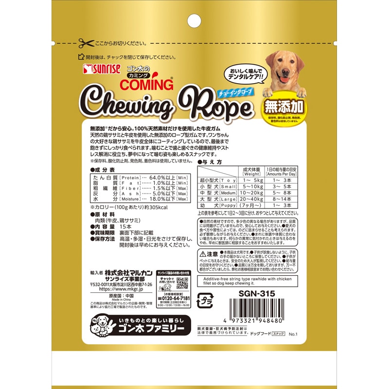 ・天然の鶏ササミと牛皮を使用した無添加のロープ型ガムです。