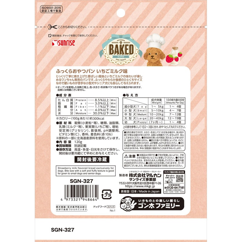 ・こんがりおいしく焼き上げた、香ばしい風味といちごミルクの味わいが楽しめるワンちゃん専用のおやつパンです。
