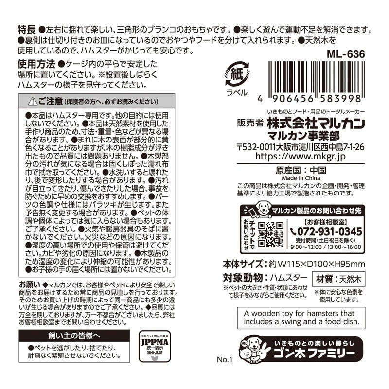 【諸注意】・本品はハムスター専用です。他の目的には使用しないでください。