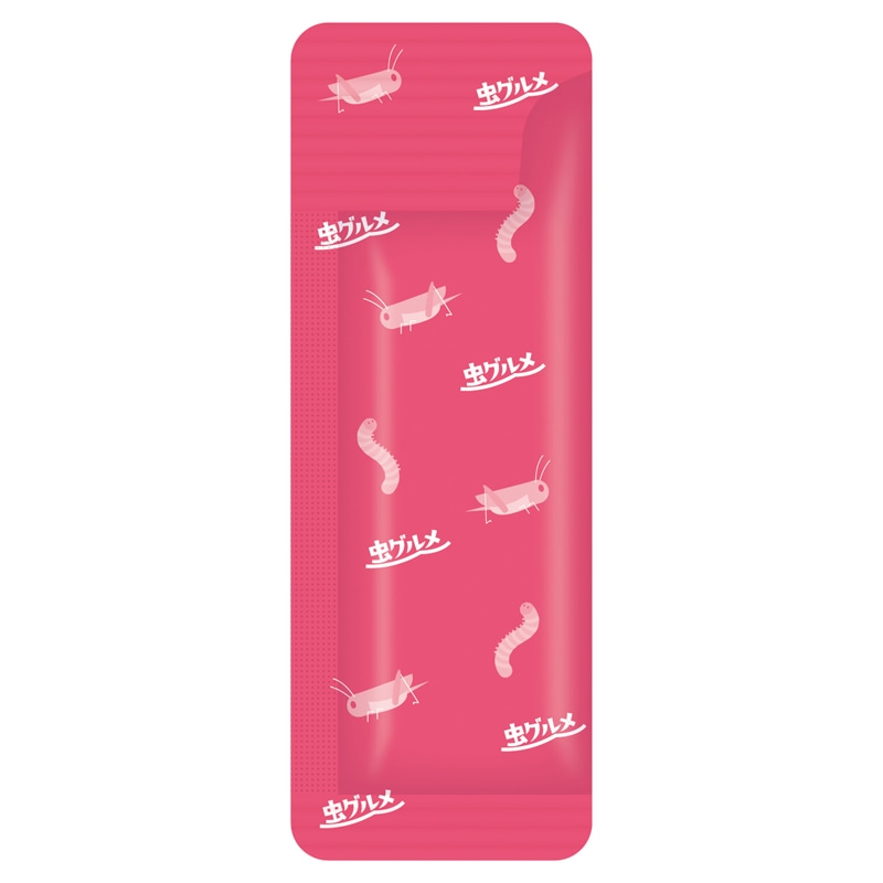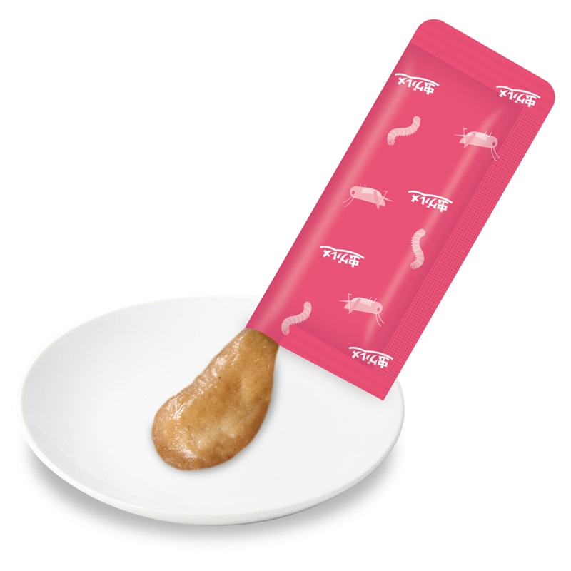 【原材料(成分)】昆虫粉末(コオロギ、ミルワーム)、鶏ささみ、大豆たん白、コーンスターチ、植物性油脂、オリゴ糖、乳化剤、ビタミン類(C、A、D3、E、K3、B1、B2、パントテン酸、ナイアシン、B6、葉酸、B12)、ミネラル類(鉄、亜鉛、銅、マンガン、ヨウ素、セレン、塩化ナトリウム、炭酸カルシウム)、増粘安定剤(グアーガム)、アミノ酸類(タウリン)、酸化防止剤(ビタミンE)