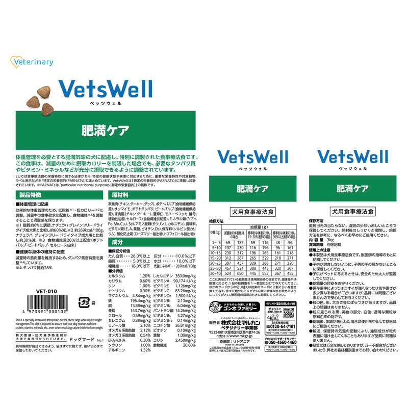「VetsWell肥満ケア」は体重管理を必要とする肥満気味の犬に配慮し、特別に調製された食事療法食です。