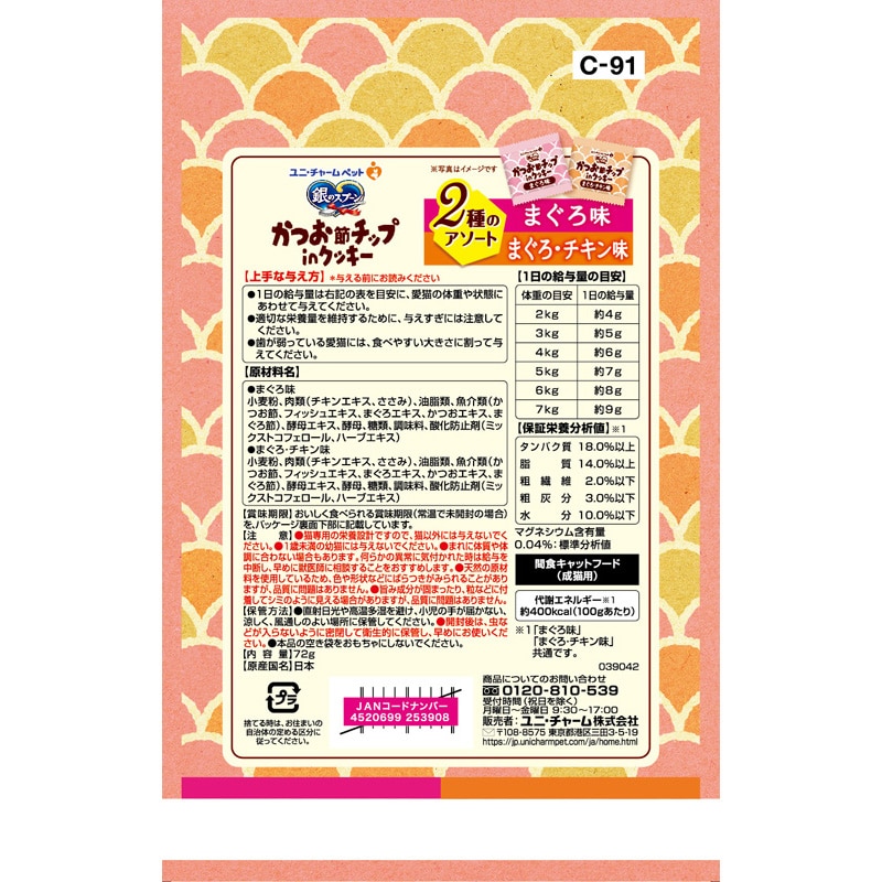 ・マーブル状のお魚味クッキー風生地にかつお節チップが入ったおやつ