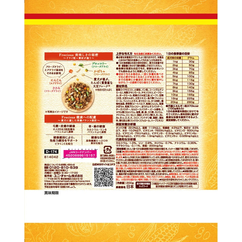 【原材料(成分)】穀類(トウモロコシ、小麦粉、パン粉、コーングルテンミール)、肉類(チキンミール、チキンエキス、ビーフミール、ポークミール、乾燥ささみ加工品、ビーフ)、豆類(大豆、大豆たんぱく、大豆エキス)、魚介類(フィッシュミール、フィッシュエキス、まぐろミール、かつお節)、動物性油脂、野菜類(ビートパルプ、乾燥にんじん、乾燥かぼちゃ、乾燥ブロッコリー、ほうれんそうパウダー)、チーズパウダー、セルロースパウダー、ビール酵母、ミネラル類(カルシウム、塩素、銅、鉄、ヨウ素、カリウム、ナトリウム、リン、セレン、亜鉛)、ビタミン類(A、B1、B2、B6、B12、D、E、K、コリン、パントテン酸、葉酸)、調味料、酸化防止剤(ミックストコフェロール、ハーブエキス)