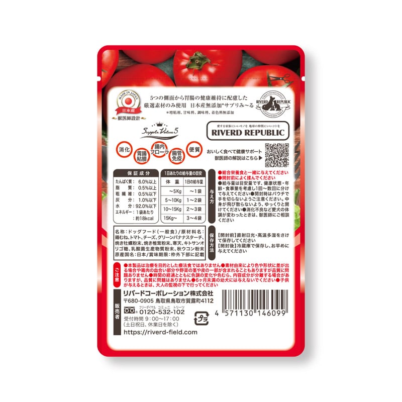 【原材料(成分)】鶏むね、トマト、チーズ、グリーンバナナスターチ、焼き牡蠣粉末、焼き椎茸粉末、寒天、キトサンオリゴ糖、乳酸菌生産物質粉末、秋ウコン粉末