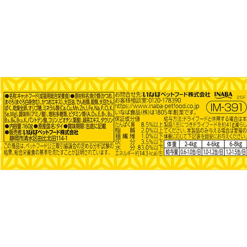 【原材料(成分)】魚介類(かつお、まぐろ(まぐろ白身含む)、かつおエキス)、大豆油、でん粉類、穀類、大豆たんぱく、乾燥全卵、オリゴ糖、ミネラル類(Ca、Cu、Mn、Zn、I、Fe、Na、P、Cl、K、Se、Mg)、調味料(アミノ酸)、増粘多糖類、ビタミン類(A、D3、E、B1、B2、B3、B6、B12、K、パントテン酸、コリン、ビオチン、葉酸)、緑茶エキス、タウリン