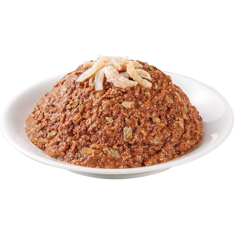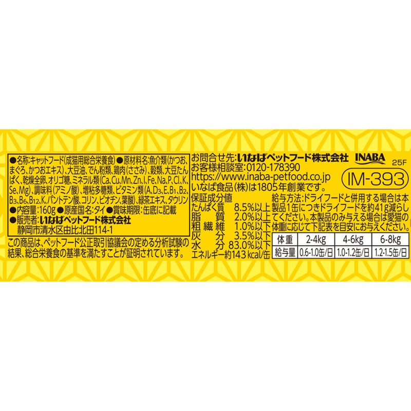 【原材料(成分)】魚介類(かつお、まぐろ、かつおエキス)、大豆油、でん粉類、鶏肉(ささみ)、穀類、大豆たんぱく、乾燥全卵、オリゴ糖、ミネラル類(Ca、Cu、Mn、Zn、I、Fe、Na、P、Cl、K、Se、Mg)、調味料(アミノ酸)、増粘多糖類、ビタミン類(A、D3、E、B1、B2、B3、B6、B12、K、パントテン酸、コリン、ビオチン、葉酸)、緑茶エキス、タウリン