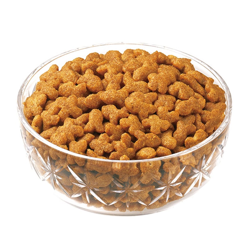 【原材料(成分)】穀類(とうもろこし、小麦粉、コーングルテンミール、ふすま等)、肉類(チキンミール、ポークミール、チキンレバーパウダー等)、動物性油脂、豆類(脱脂大豆)、酵母エキス、セルロース、魚介類(まぐろパウダー等)、野菜類(にんじんパウダー、かぼちゃパウダー、ほうれん草パウダー等)、ミネラル類(Na、Cl、Ca、P、K、Fe、Zn、Cu、Mn、Co、I)、ビタミン類(A、B1、B2、B6、B12、C、D3、E、K3、コリン、ナイアシン、パントテン酸、葉酸、ビオチン)、アミノ酸類(メチオニン、リジン、タウリン)、緑茶エキス、酸化防止剤(ハーブ抽出物、ミックストコフェロール)