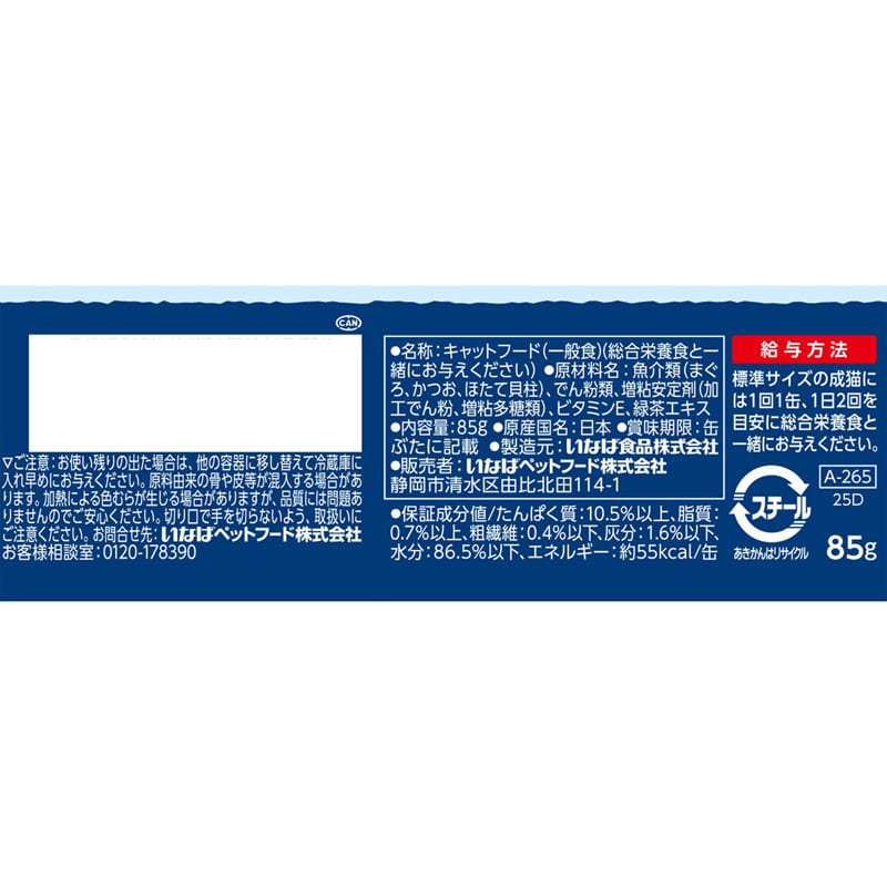 【給与方法】・標準サイズの成猫には1日1缶、1日2回を目安に総合栄養食と一緒にお与えください。