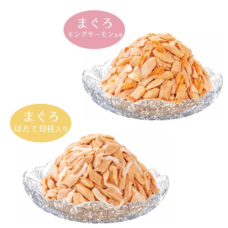・まぐろとかつおの細かめフレークを焼津産かつおだしで仕上げ、猫ちゃんのほたてやサーモンをトッピングし、やわらかいゼリーで包みました。