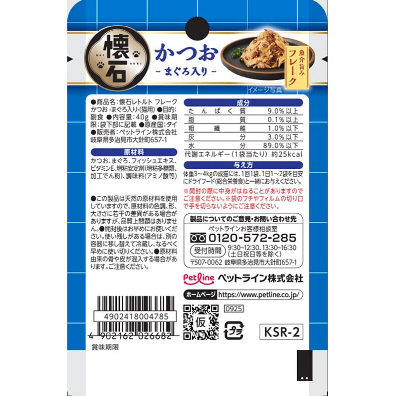 【原材料(成分)】かつお、まぐろ、フィッシュエキス、ビタミンE、増粘安定剤(増粘多糖類、加工でん粉)、調味料(アミノ酸等)