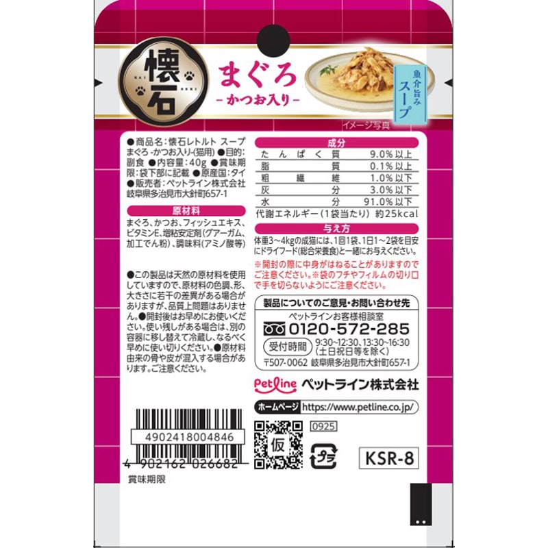 【原材料(成分)】まぐろ、かつお、フィッシュエキス、ビタミンE、増粘安定剤(グアーガム、加工でん粉)、調味料(アミノ酸等)