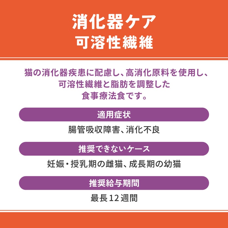 「VetsWell消化器ケア可溶性繊維」は猫の消化器疾患に配慮し、特別に調製された食事療法食です。