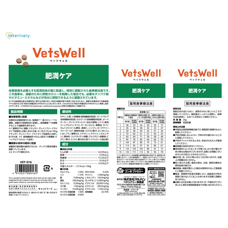 「VetsWell肥満ケア」は体重管理を必要とする肥満気味の猫に配慮し、特別に調製された食事療法食です。