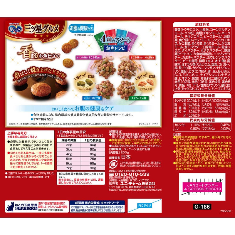 【原材料(成分)】穀類(トウモロコシ、小麦粉、コーングルテンミール、パン粉)、肉類(チキンミール、ポークミール、チキンエキス、ビーフミール)、油脂類、魚介類(フィッシュミール、フィッシュエキス、かつお節、まぐろ節、まぐろミール、かつおミール、煮干パウダー、白身魚ミール、乾燥シラス、タイパウダー、ホタテパウダー)、野菜類(ビートパルプ(食物繊維源))、ニンジンパウダー、カボチャパウダー、ホウレンソウパウダー)、ビール酵母、酵母エキス、オリゴ糖、調味料、ミネラル類(カルシウム、塩素、コバルト、銅、鉄、ヨウ素、カリウム、マンガン、ナトリウム、リン、亜鉛)、ビタミン類(A、B1、B2、B6、B12、C、D、E、K、コリン、ナイアシン、パントテン酸、ビオチン、葉酸)、着色料(二酸化チタン、赤色102号、黄色4号、黄色5号、青色1号)、アミノ酸類(タウリン)、酸化防止剤(ミックストコフェロール、ハーブエキス)