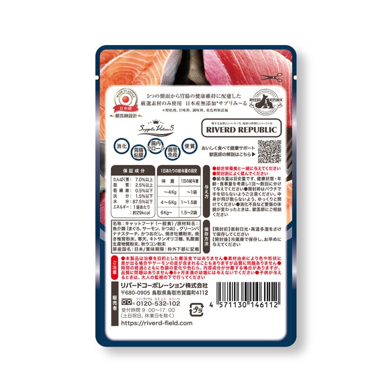 【原材料(成分)】魚介類(まぐろ、サーモン、かつお)、グリーンバナナスターチ、かつおだし、焼き牡蠣粉末、焼き椎茸粉末、寒天、キトサンオリゴ糖、乳酸菌生産物質粉末、秋ウコン粉末