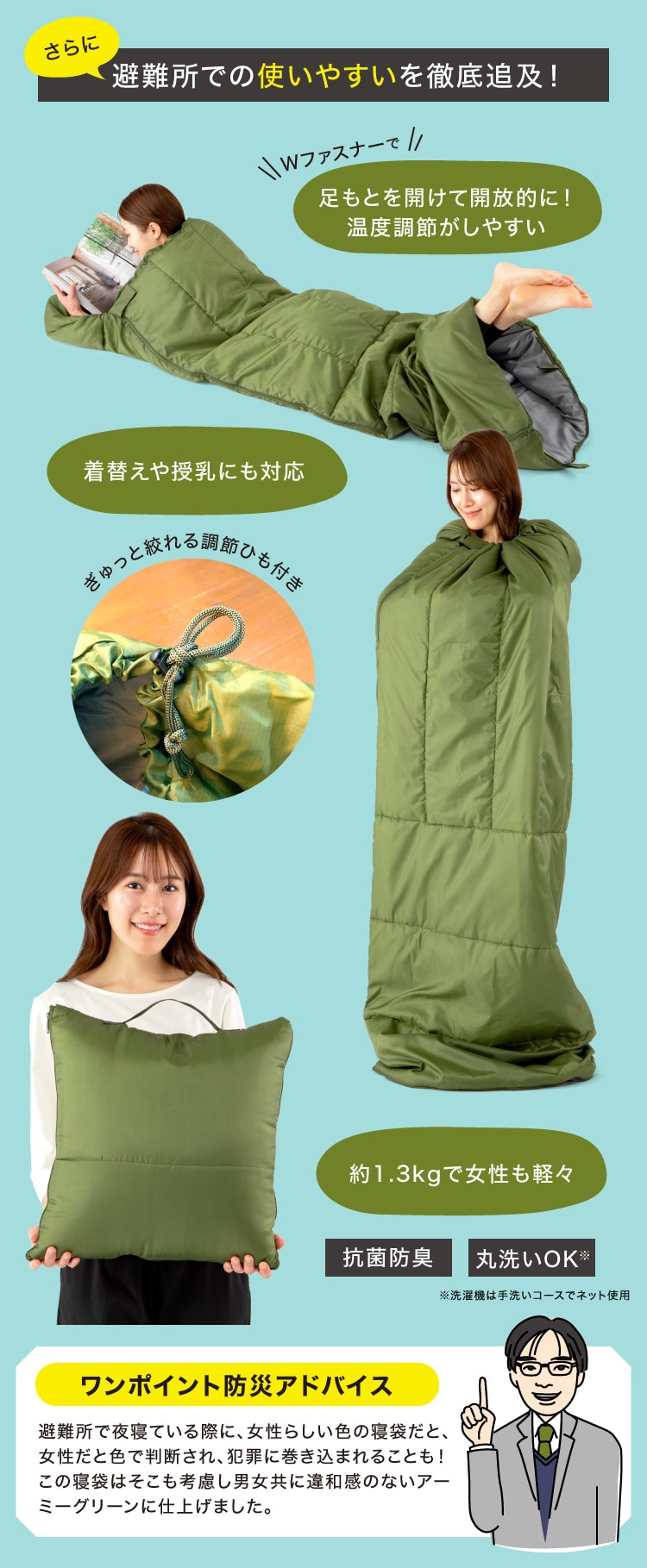防災のプロが本気で考え抜いた、寝袋に変身するクッションです。