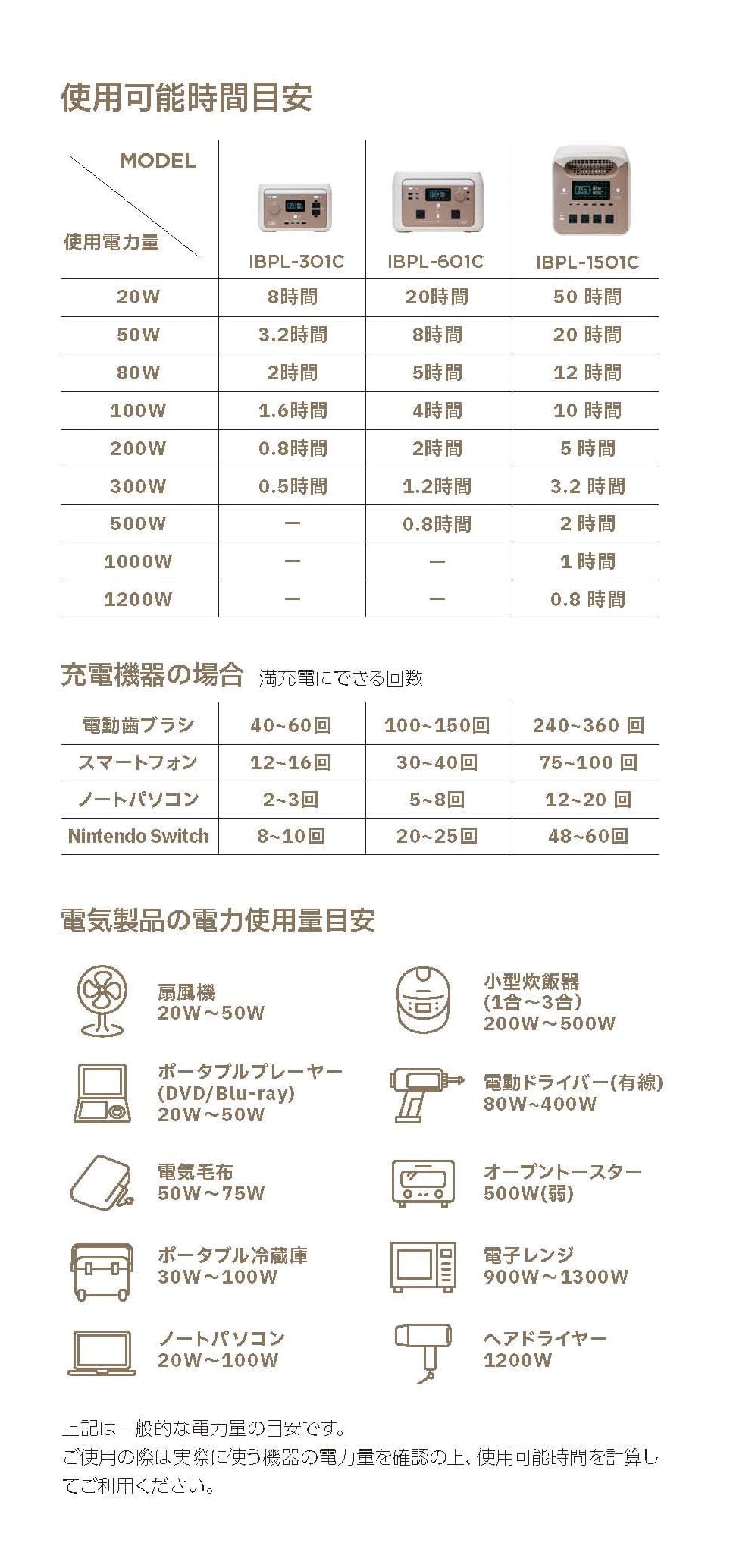 AC入力:100V 最大1200W 12A 50/60Hz(充電時間目安 約1.5時間)