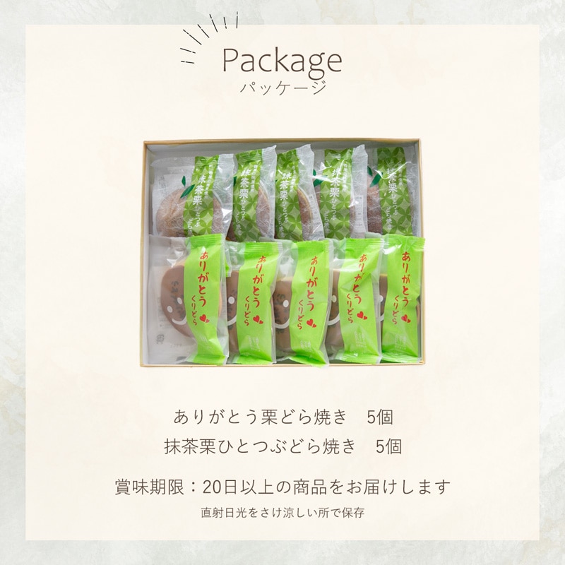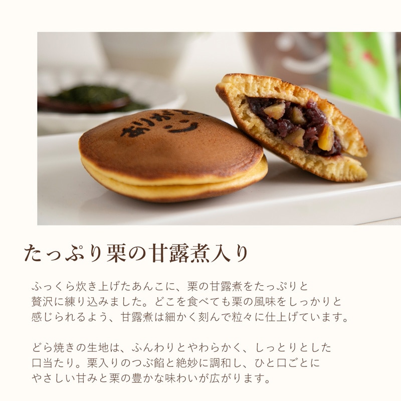 ありがとうとニッコリ笑顔が可愛い栗どら焼きと栗の甘露煮が丸ごと一つ入った抹茶どら焼き3種セット